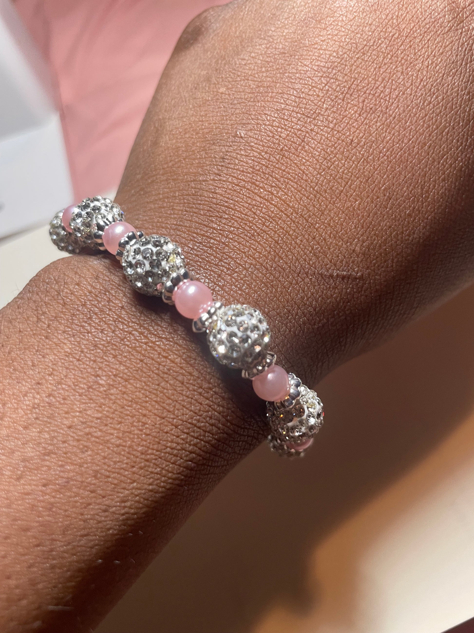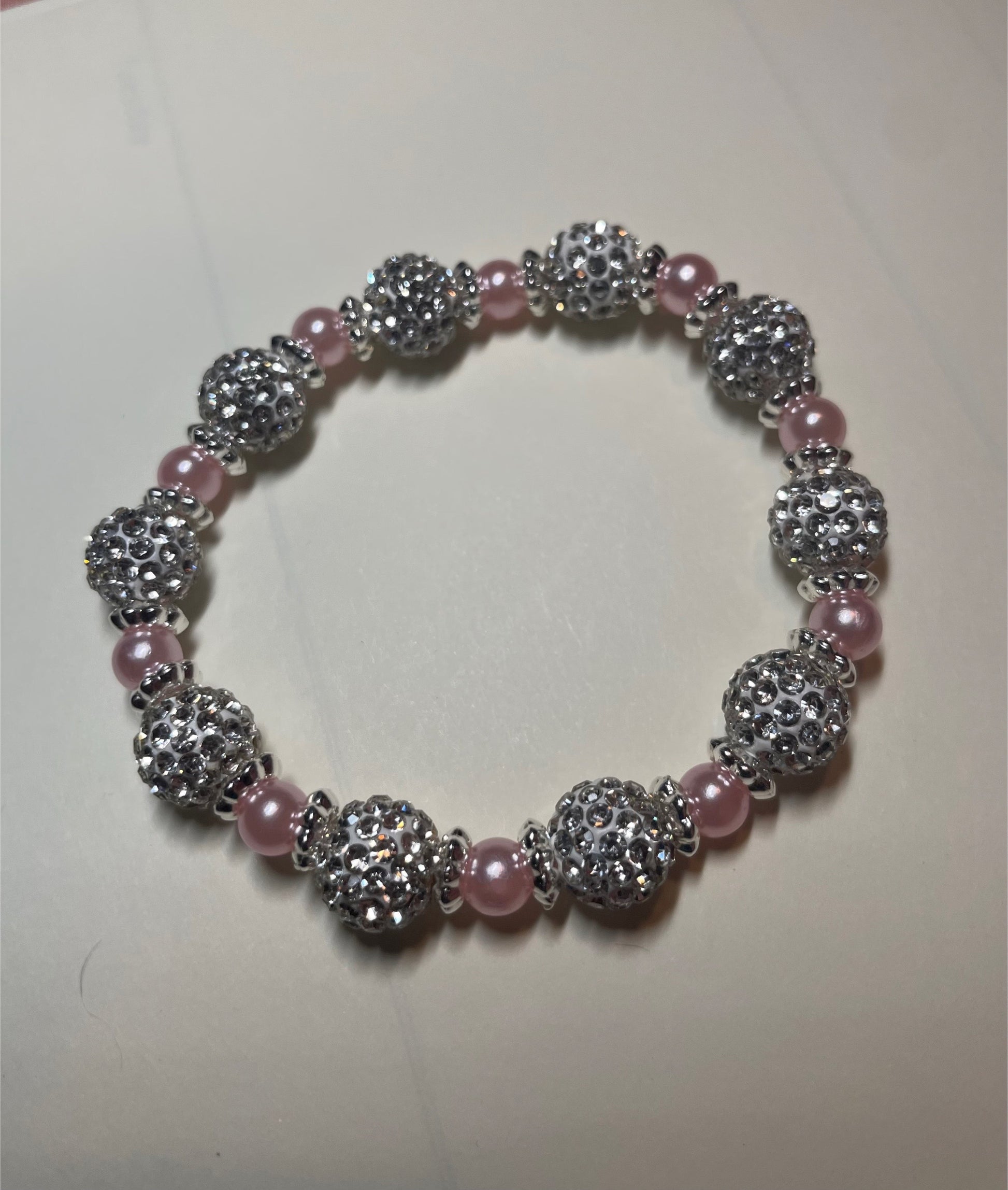 This beautiful pink and silver bead bracelet is handmade. It is about seven inches, but is stretchable to fit on wrists. If bigger or smaller size needed, six or eight inch version can be done!
